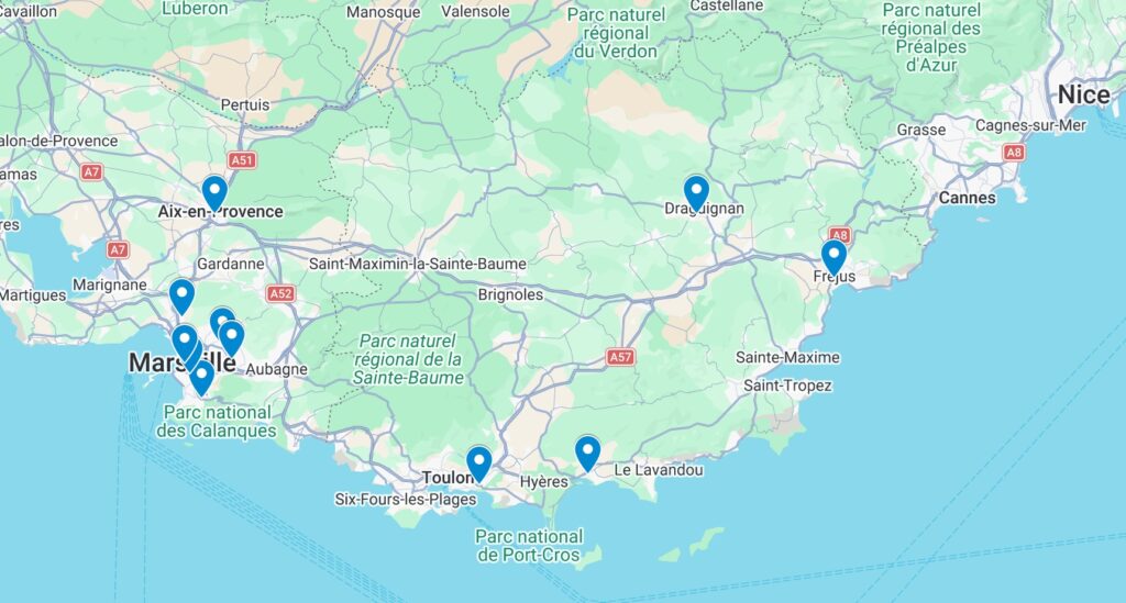 Voici la localisation des stations en région PACA (cliquez sur la carte) :